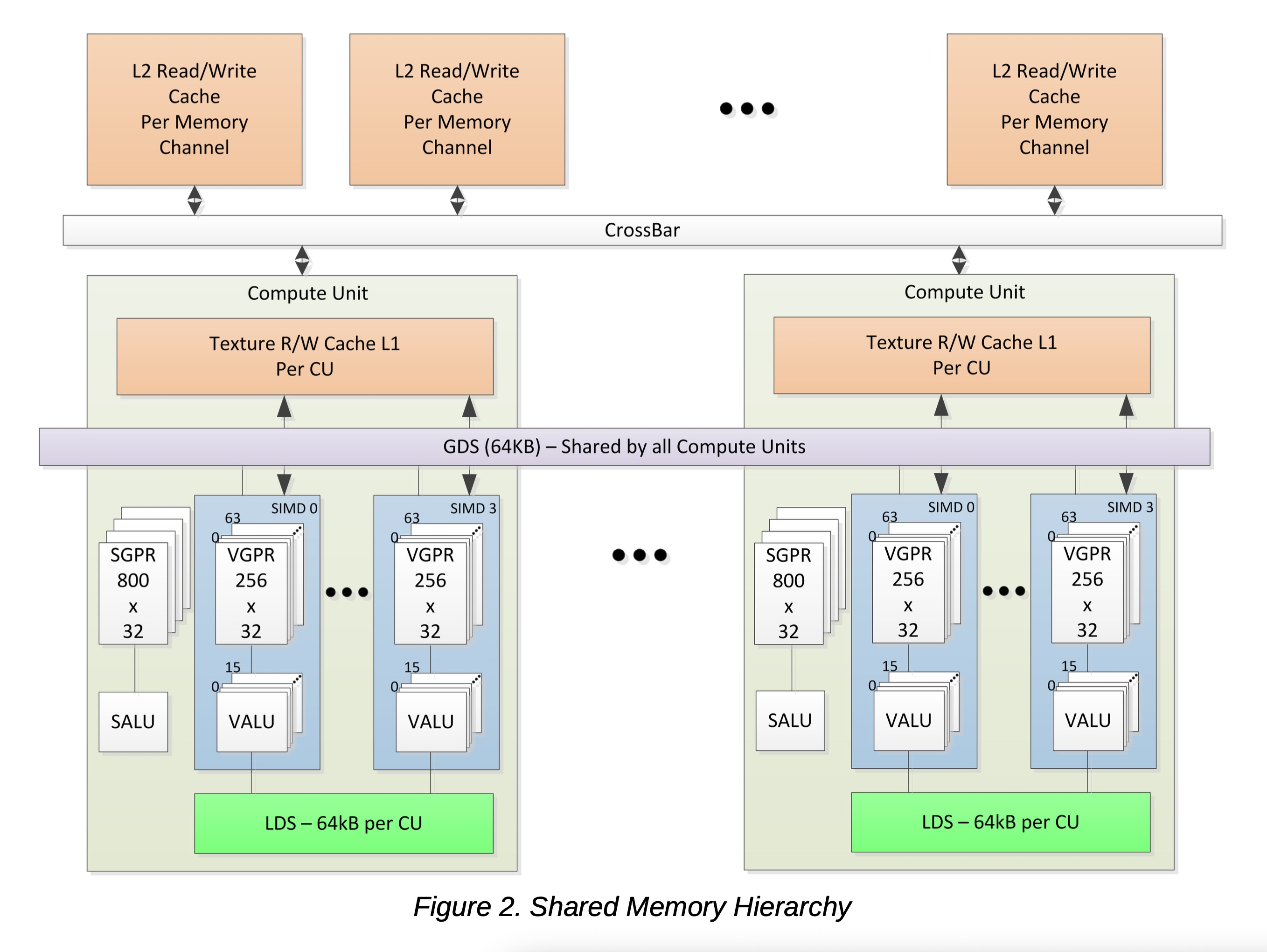 AMD GCN 设备提供了多种方法,供每个计算单元(CU)内的处理元件访问片外内存。在主读路径上,设备由多个 L2 只读缓存通道组成,这些通道为每个计算单元(CU)提供数据给 L1 缓存。