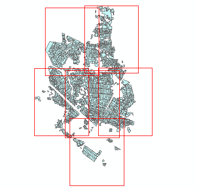 批量分幅问题:我们拿到的一个村,进行公示出图,有出图比例尺(1:2000)的要求。受限于打印尺寸(最大A0),一个村的公示需要分幅成多张。用渔网进行切割,地块可能分别属于两个图幅,这是要解决的点:自动生成数据框对应的分幅范围,对所有地块分幅。