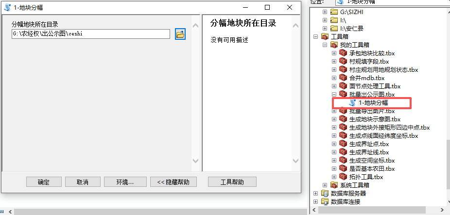 这里用到arcgis工具插件---1-地块分幅。打开上面DK.shp所在的目录,执行工具即可。