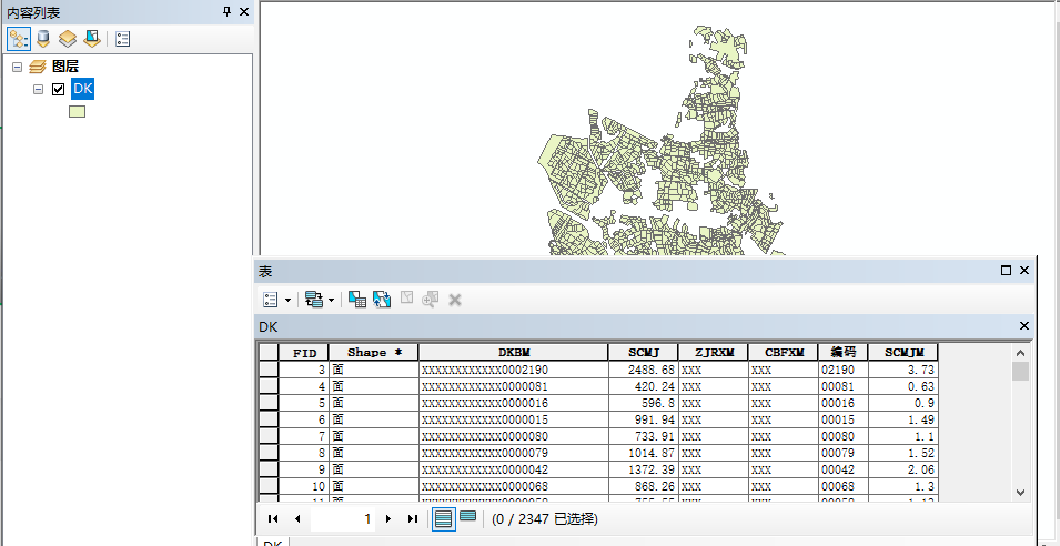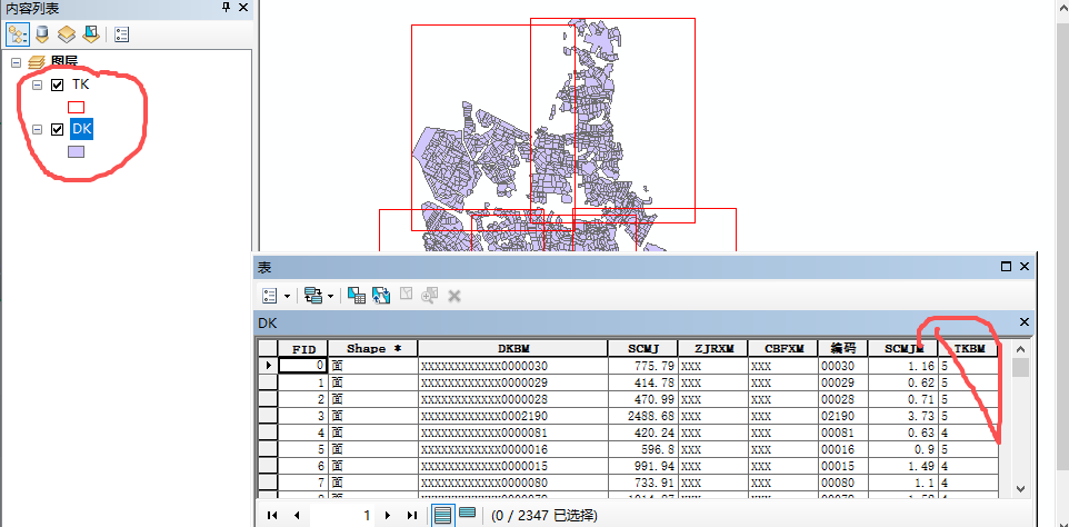 1、第一个难点解决,对地块进行分幅:对输入的DK.shp新建"TKBM"字段,将不同地块分到不同的图幅中,并生成TK.shp(1:2000数据框在大地两千坐标下的矩形框)。