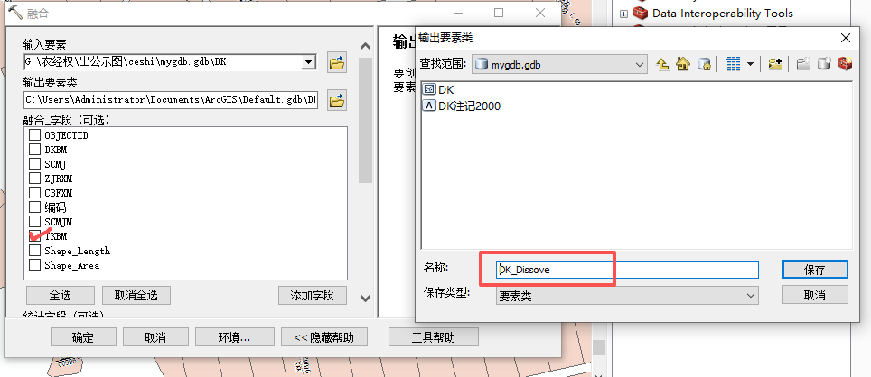 3、难点三:批量导公示图。先在地理数据库中融合一下地块。地理处理---融合---融合DK的字段为TKBM。存储要素名称DK_Dissove。