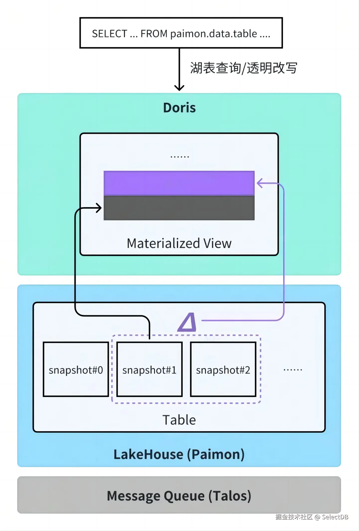 自 Doris 2.1 版本引入异步物化视图能力后,只需在 Doris 中声明物化视图定义,系统即可自动完成从外部数据湖(如 Iceberg)增量同步、数据聚合、更新调度等全过程,无需额外开发 ETL 链路,也无需关注底层执行细节,显著降低了开发与运维负担。同时,Doris 支持物化视图改写能力,用户仍可使用原有 SQL 查询原始表,系统会自动识别并将其透明改写为对应的物化视图,实现查询加速。目前该功能基于增量方式实现,主要支持仅追加场景,更新场景仍处于研发状态。