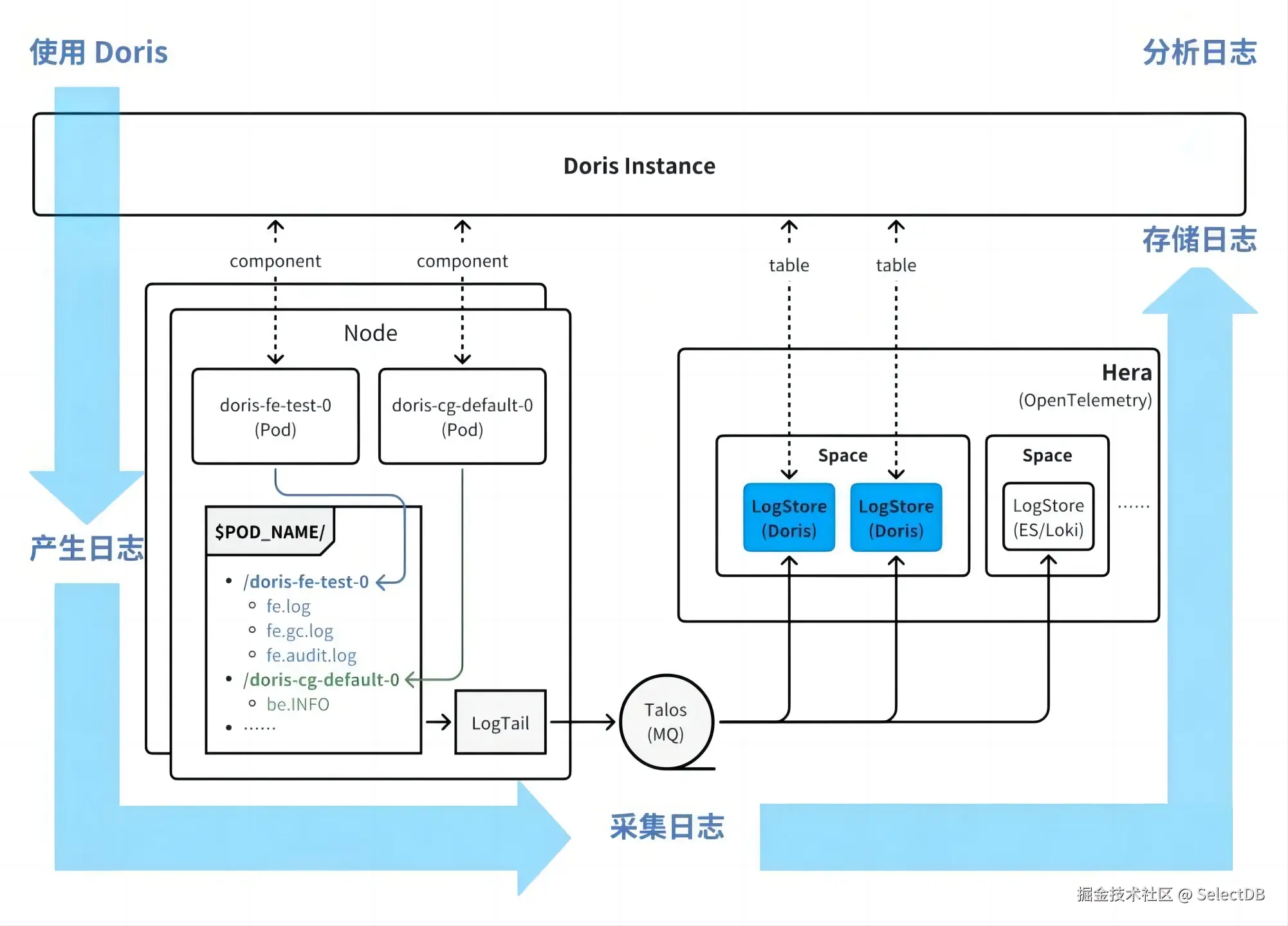 在日志采集方面,采用自研的 Hera(log tail 组件)实现高效采集,同时,借鉴社区的日志检索场景实践,将 Doris 作为 OpenTelemetry 的存储后端:Doris 自身运行产生的日志经采集后,最终回流并存储至 Doris 内部表中,形成"日志产生-采集-存储-查询"的闭环。