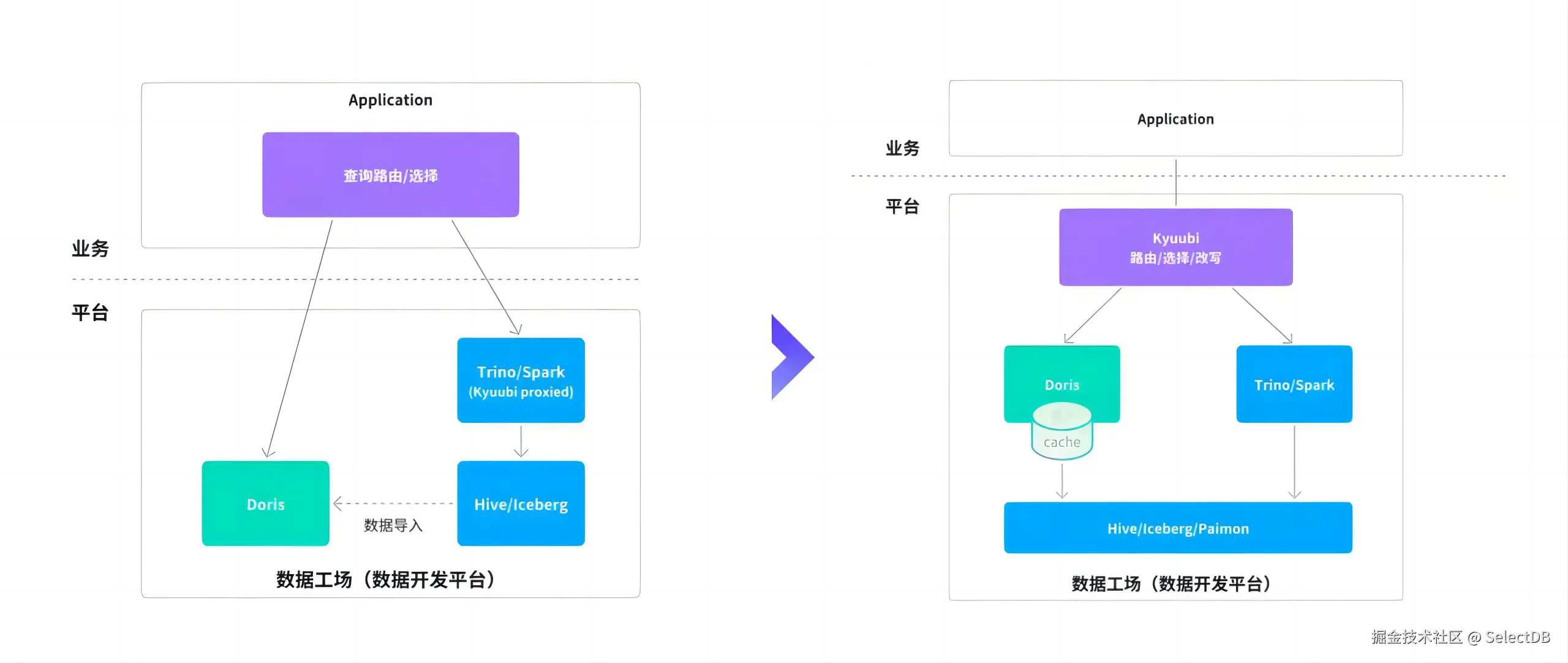 基于此,数据开发平台的整体架构发生变化:Doris 不再局限于传统"外仓"的角色,而是向上演进为统一的查询引擎层,与底层 Iceberg、Paimon 等湖仓格式解耦,直接进行联邦查询,同时利用自身的数据缓存、物化视图等能力对热点数据进行加速,兼顾灵活性与高性能。