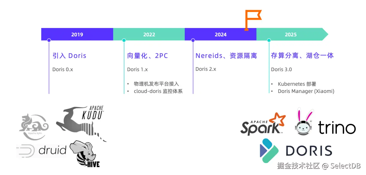 早期小米技术栈复杂多样,数据湖体系与 OLAP 引擎众多。自 2019 年在小米内部投入应用以来,Apache Doris 逐渐从中脱颖而出,发展成为小米数据架构的核心引擎。