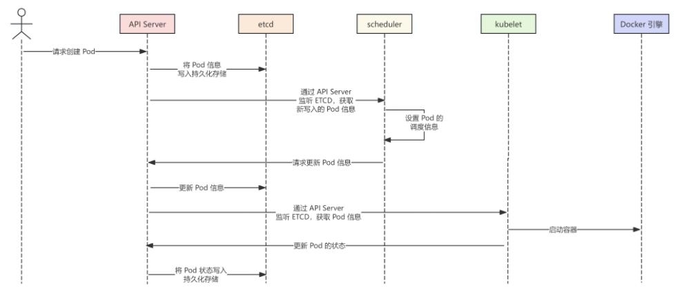 第一步: 客户端提交创建Pod的请求,可以通过调用API Server的Rest API接口,也可以通过kubectl命令行工具。如kubectl apply -f filename.yaml(资源清单文件)