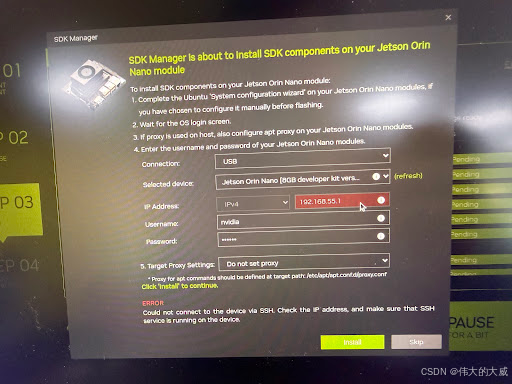 现象: 刷完系统后,安装 SDK 组件时报错 "Could not connect to the device via SSH"。