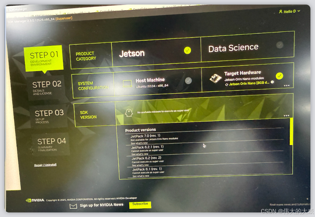 进入 SDK Manager 后,Step 01 选择 Jetson Orin Nano 和 JetPack 6.1。