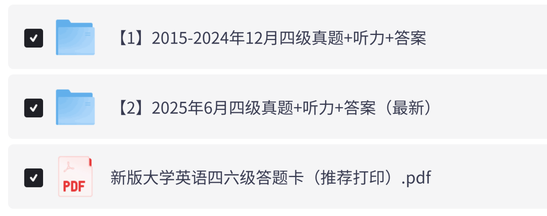 2025年下半年英语六级考试将于12月13日举行,倒计时12天!大鱼整理了2015年到2025年6月的全国大学英语四级CET4真题试卷、听力音频材料及详细答案解析,PDF高清电子版,可免费下载打印。