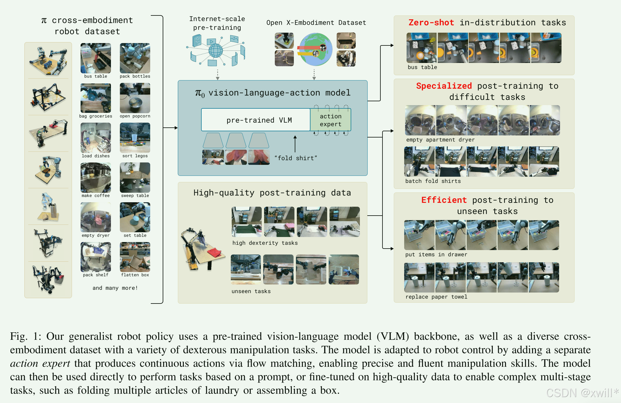 要将机器人学习提升到构建有效现实世界系统所需的通用水平,在数据 、泛化能力 和鲁棒性 方面仍面临重大障碍。要走**Generalist Robot Policies(通用机器人策略)*的路子,也就是打造所谓的*Robot Foundation Models(机器人基础模型) 。这意味着不再为每一个任务单独训练一个小模型,而是训练一个大模型来解决所有问题。本文提出了一种建立在预训练视觉语言模型的基础上,动作生成则采用流匹配的架构(Flow Matching Architecture,是一个生成式AI的概念。以往的机器人动作生成常用Diffusion(扩散模型),而Flow Matching是比Diffusion更新、效率通常更高的一种生成范式。)