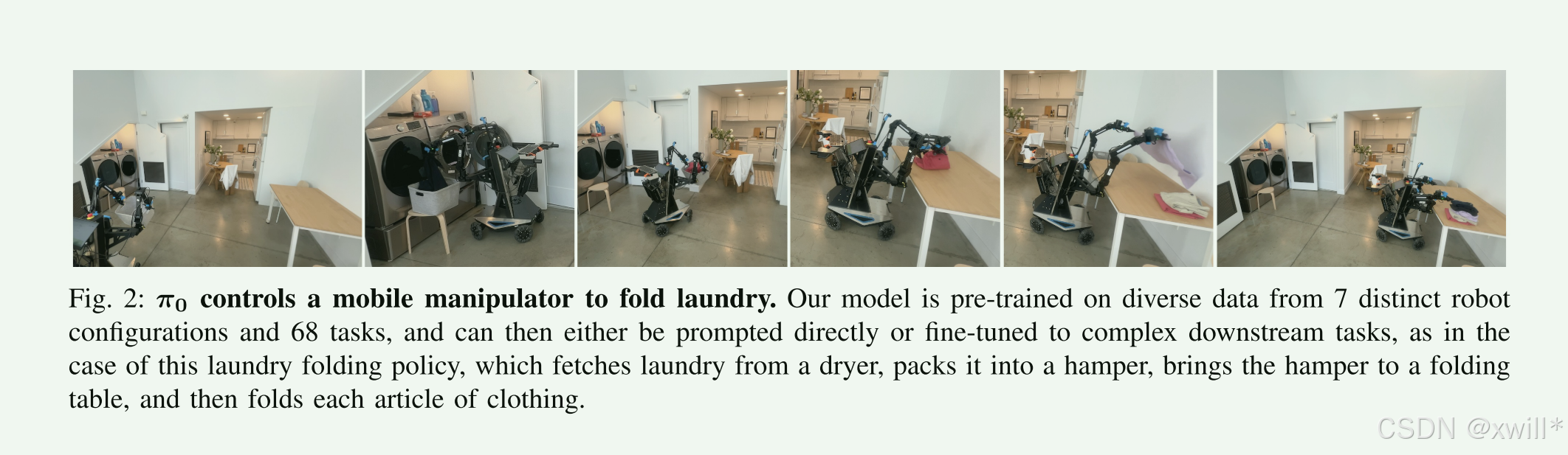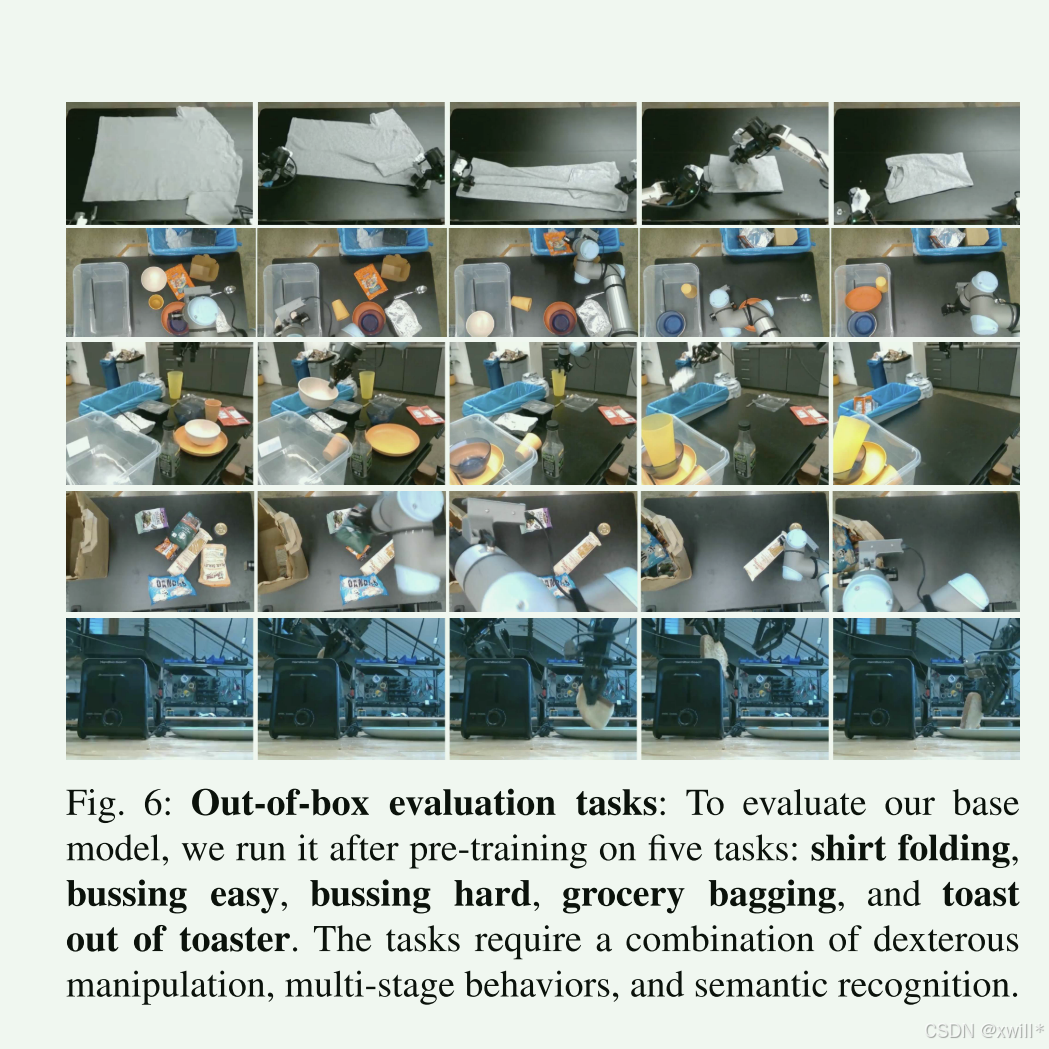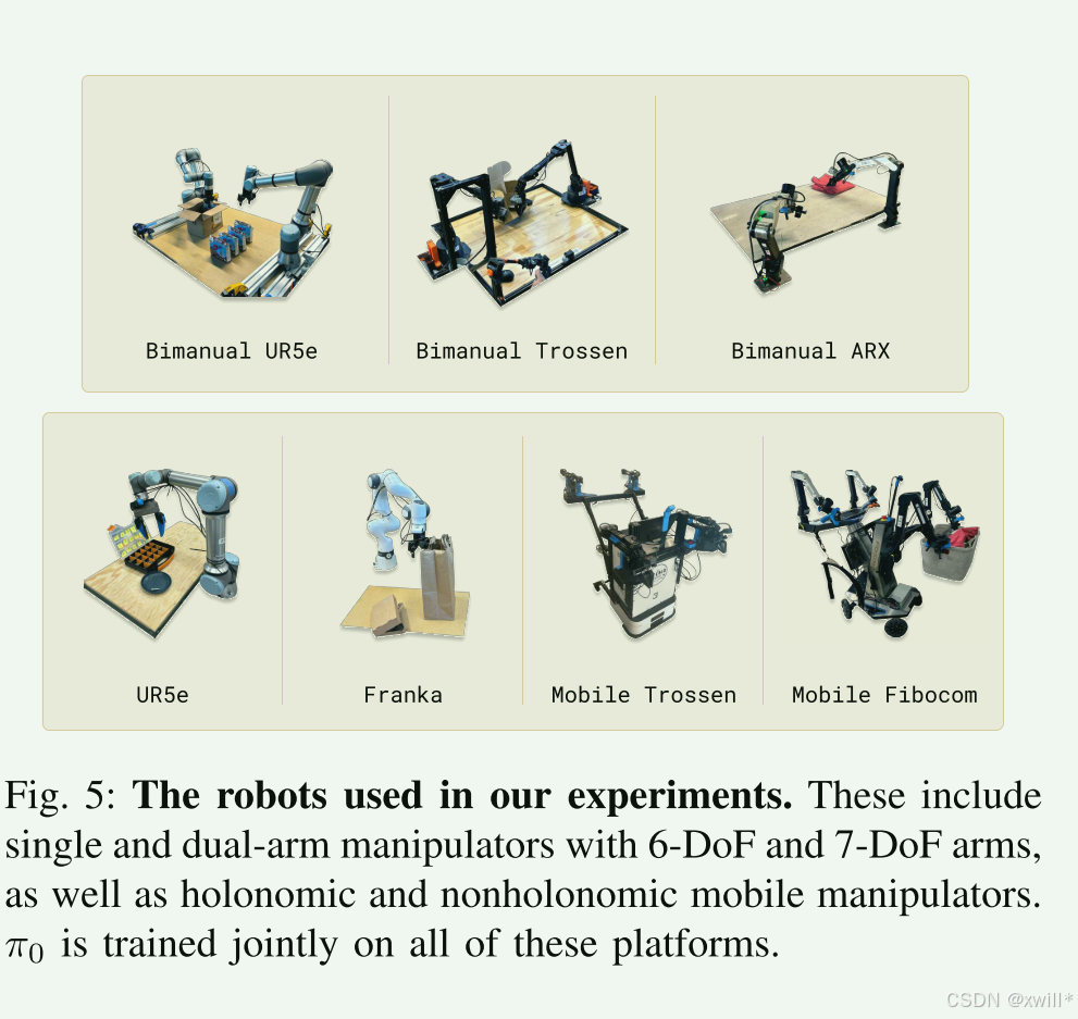 Cross-embodiment(跨具身): 模型能够控制单臂、双臂、移动底盘。这意味着模型理解的是"操作逻辑"而不是死记硬背电机的转动。