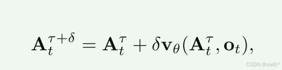 在推理(Inference)**时,通过从 τ=0 到 τ=1 对学习到的向量场进行积分来生成动作,起始点为随机噪声 At0∼N(0,I)。使用前向欧拉积分规则