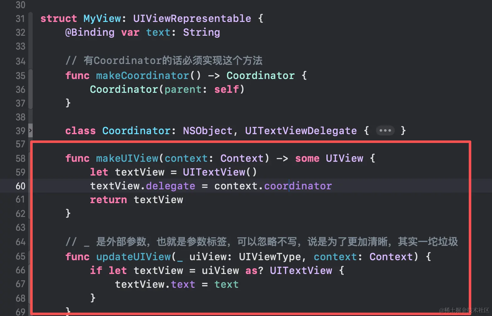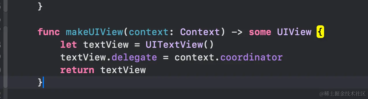 一个是makeUIView函数,用来初始化UITextView这个组件,只会执行一次,用来初始化等操作。