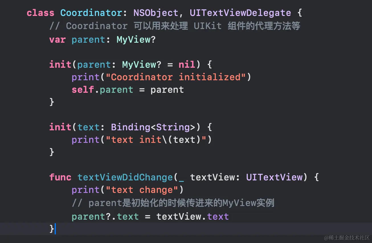 Coordinator是协调器,用于继承 NSObject, UITextViewDelegate然后实现其中的方法,然后作为UITextView的代理,当UITextView文本内容发生变化后,就委托代理里面的方法,比如刚开始输入和已修改等操作函数。