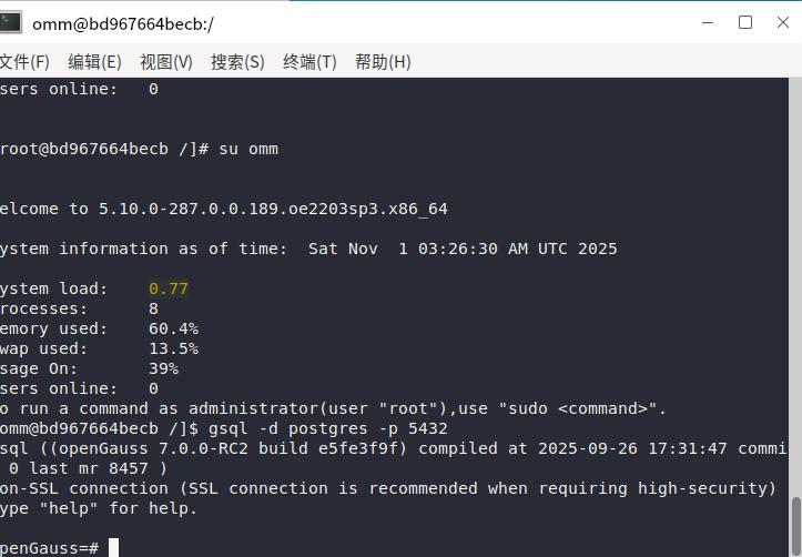 # 在容器内连接数据库(默认用户omm,数据库postgres,端口5432)