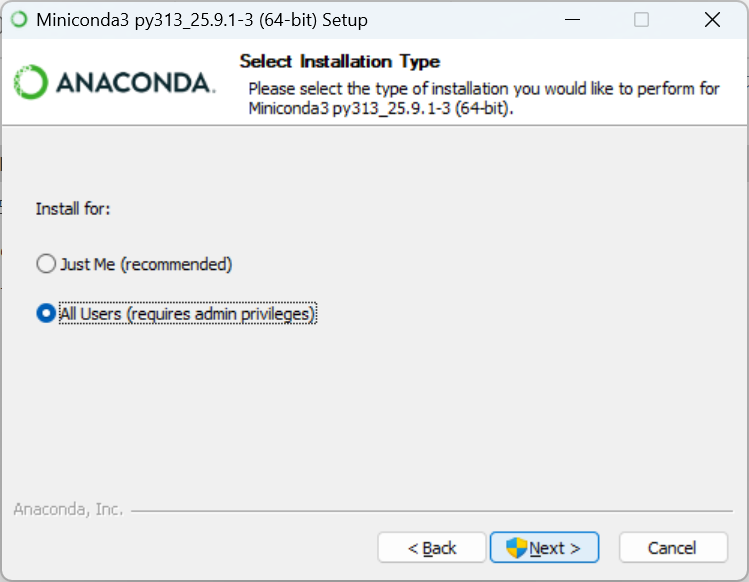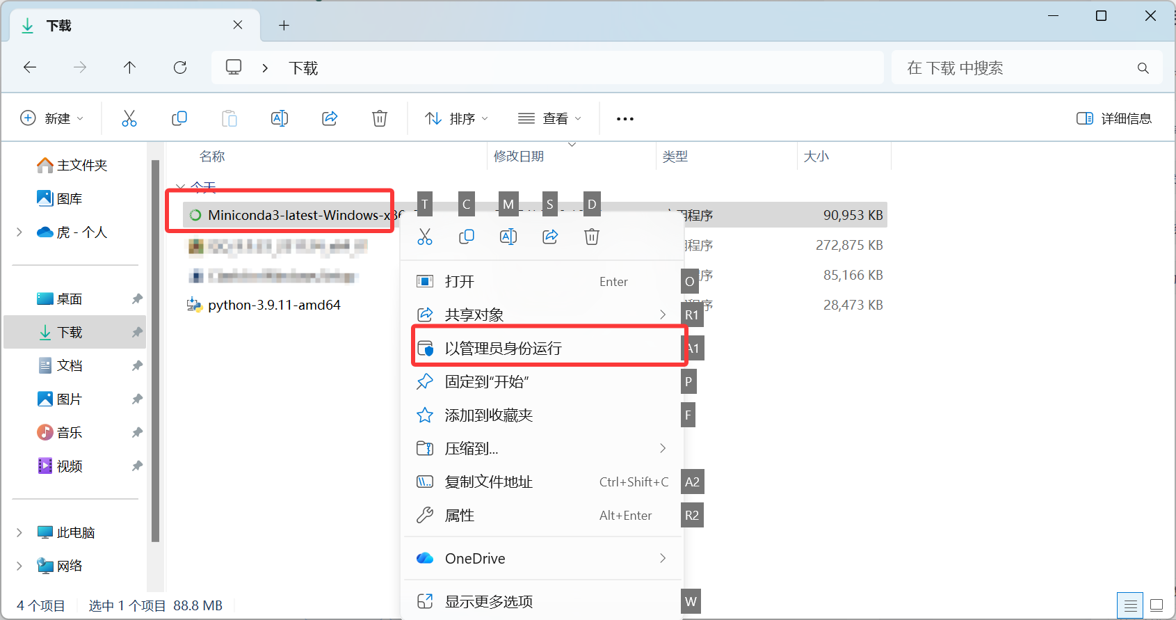 step4(可选):根据终端管理员所提供的路径(红色框框起来的),找到在文件资源管理中心找到miniconda安装包,选择管理员安装。