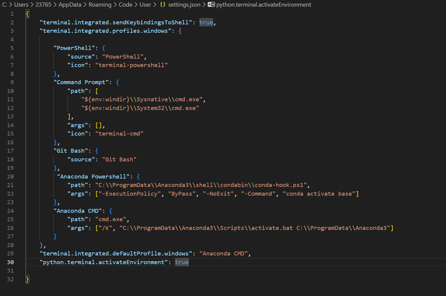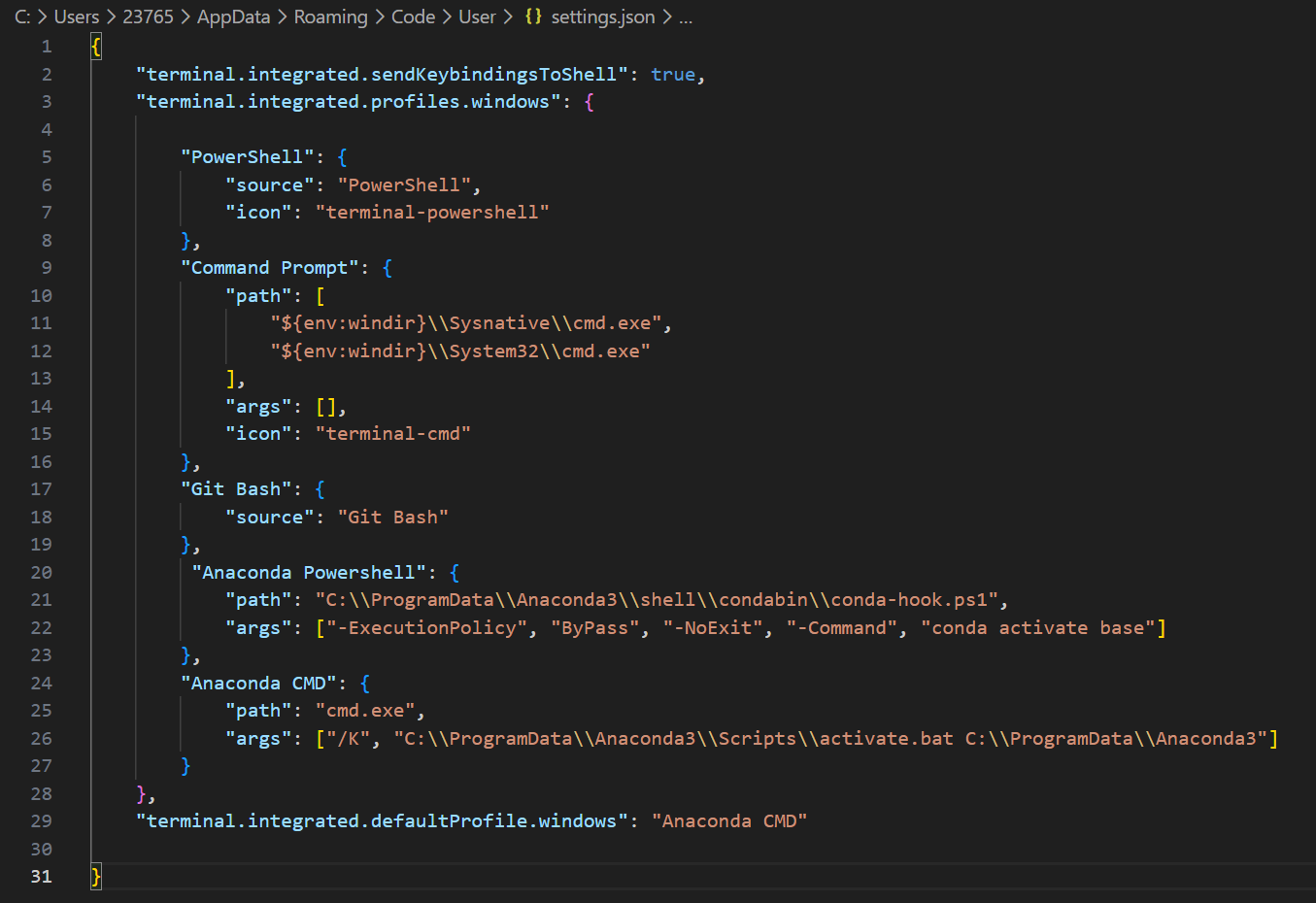 step2:在 settings.json 中添加如下的代码来定义 Anaconda 环境为终端配置