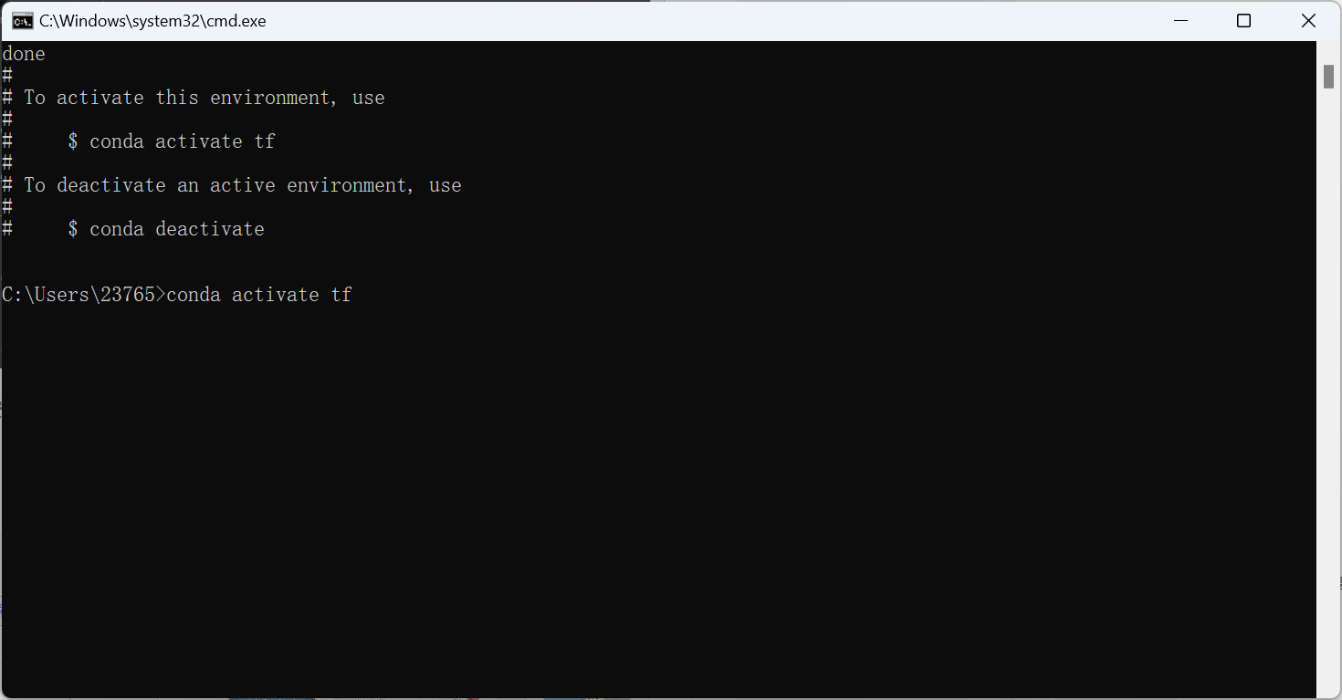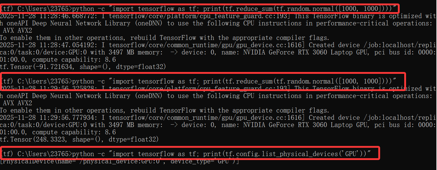 step6:依旧在原来的终端中输入以下指令,验证所安装的TensorFlow是否可用