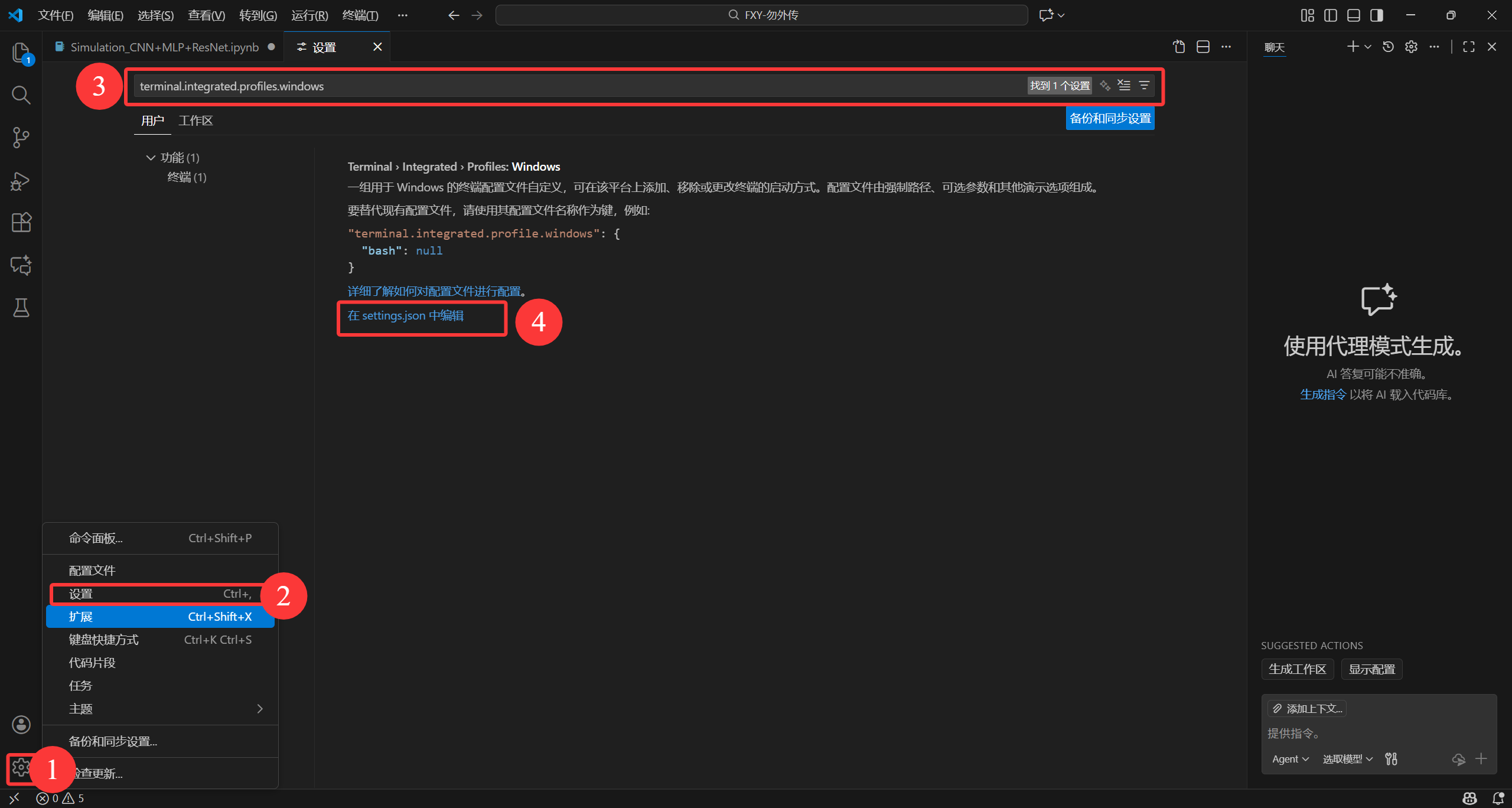 - 点击 Edit in settings.json(在图中位置4处有这个选项,点击打开)。