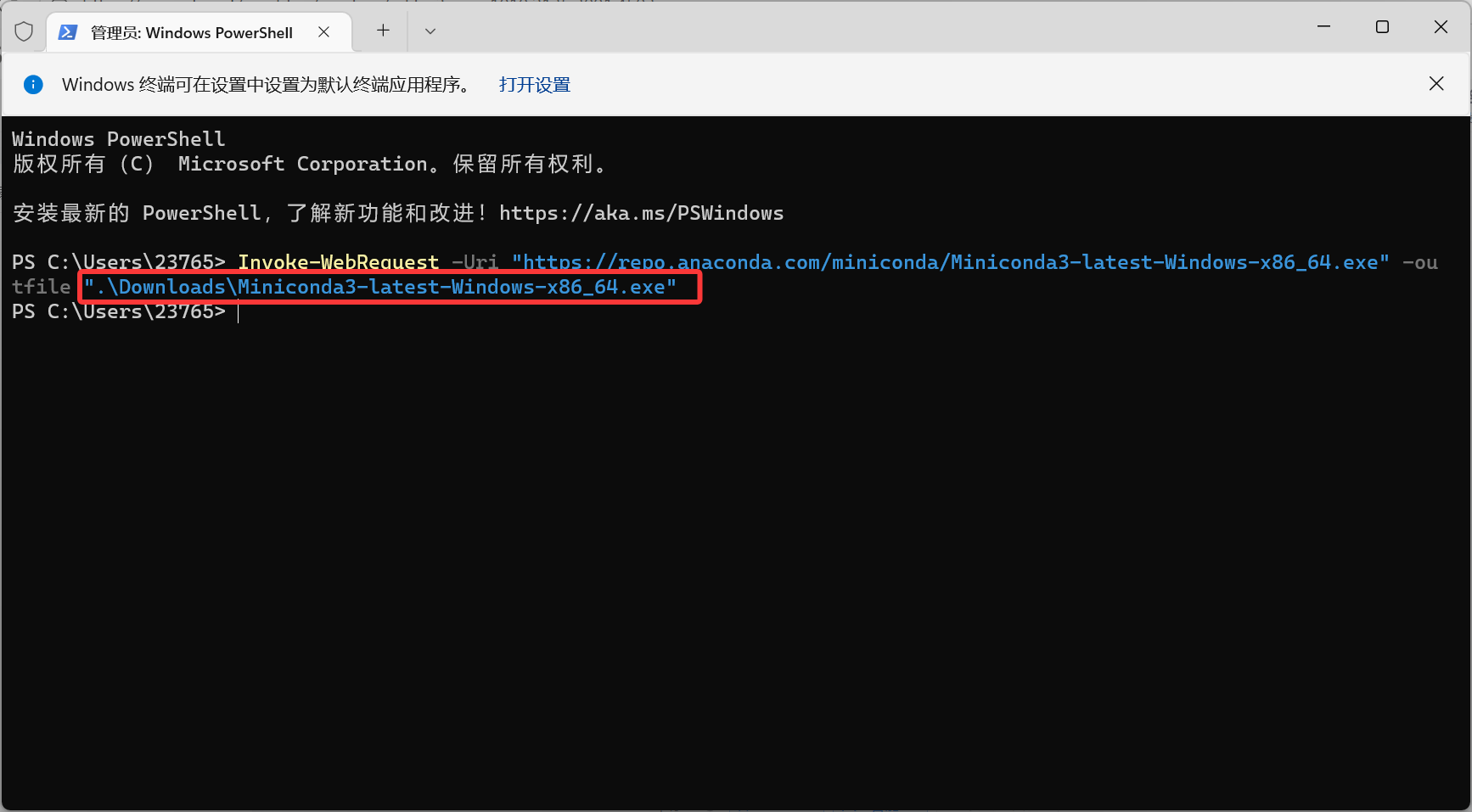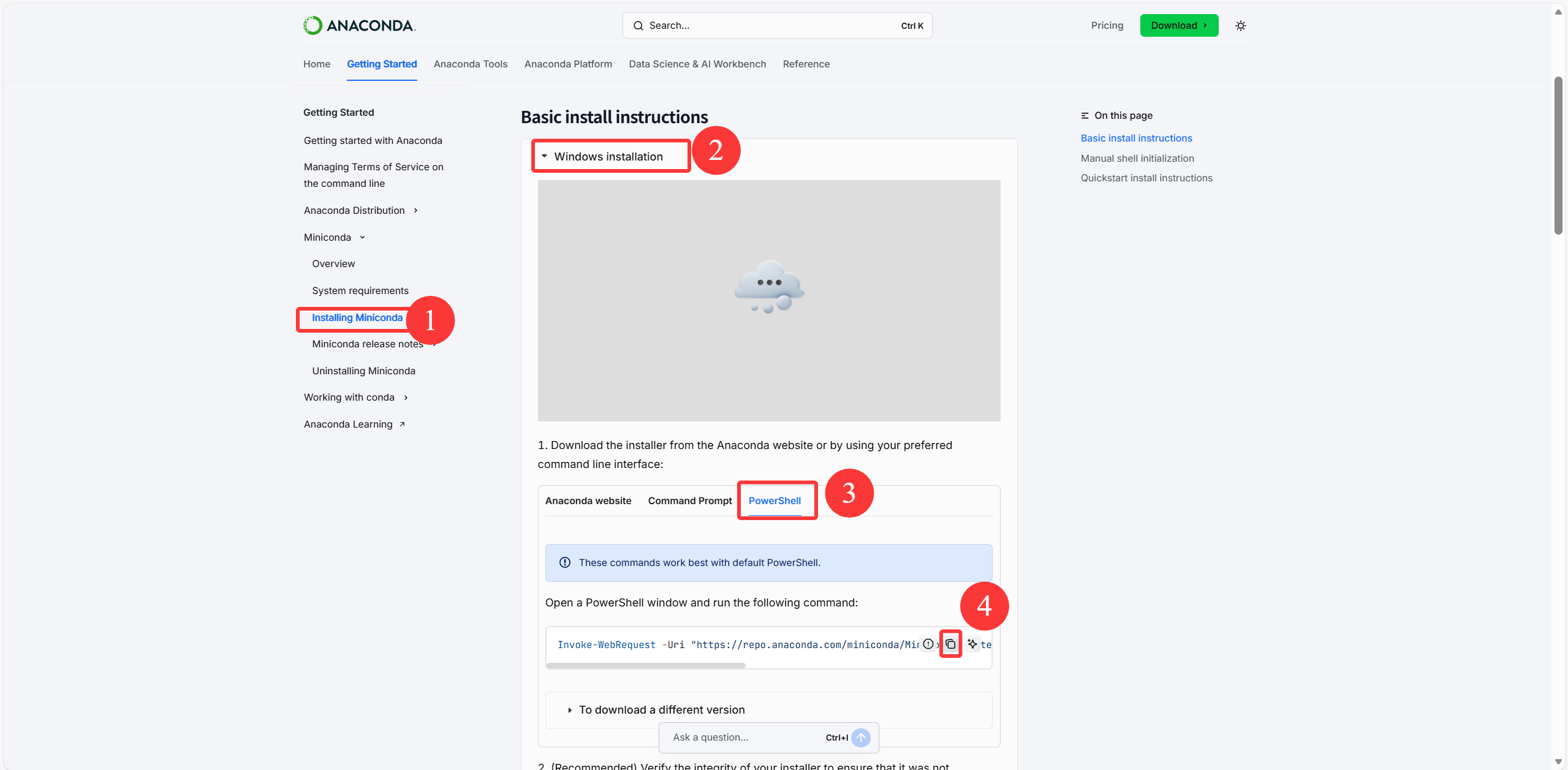 step1:打开miniconda官网(Miniconda - Anaconda),在依次点击installing miniconda->Windows installation->PowerShell->④(复制),会自动复制一条指令的,step2需要用到。
