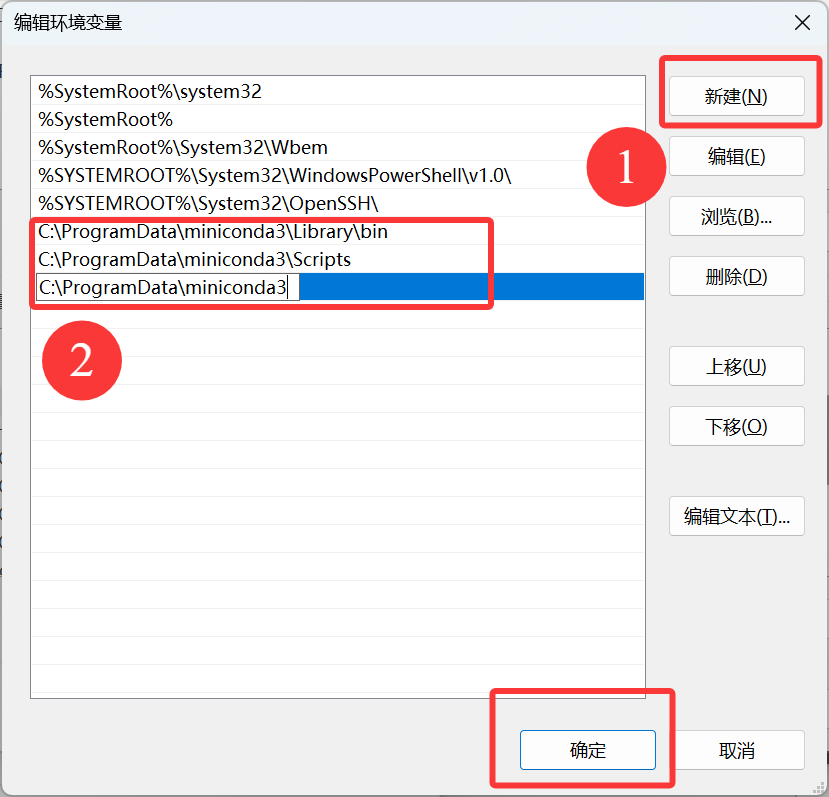 step6:将miniconda添加至系统环境变量中,以便于后续在windows终端中可以使用conda指令