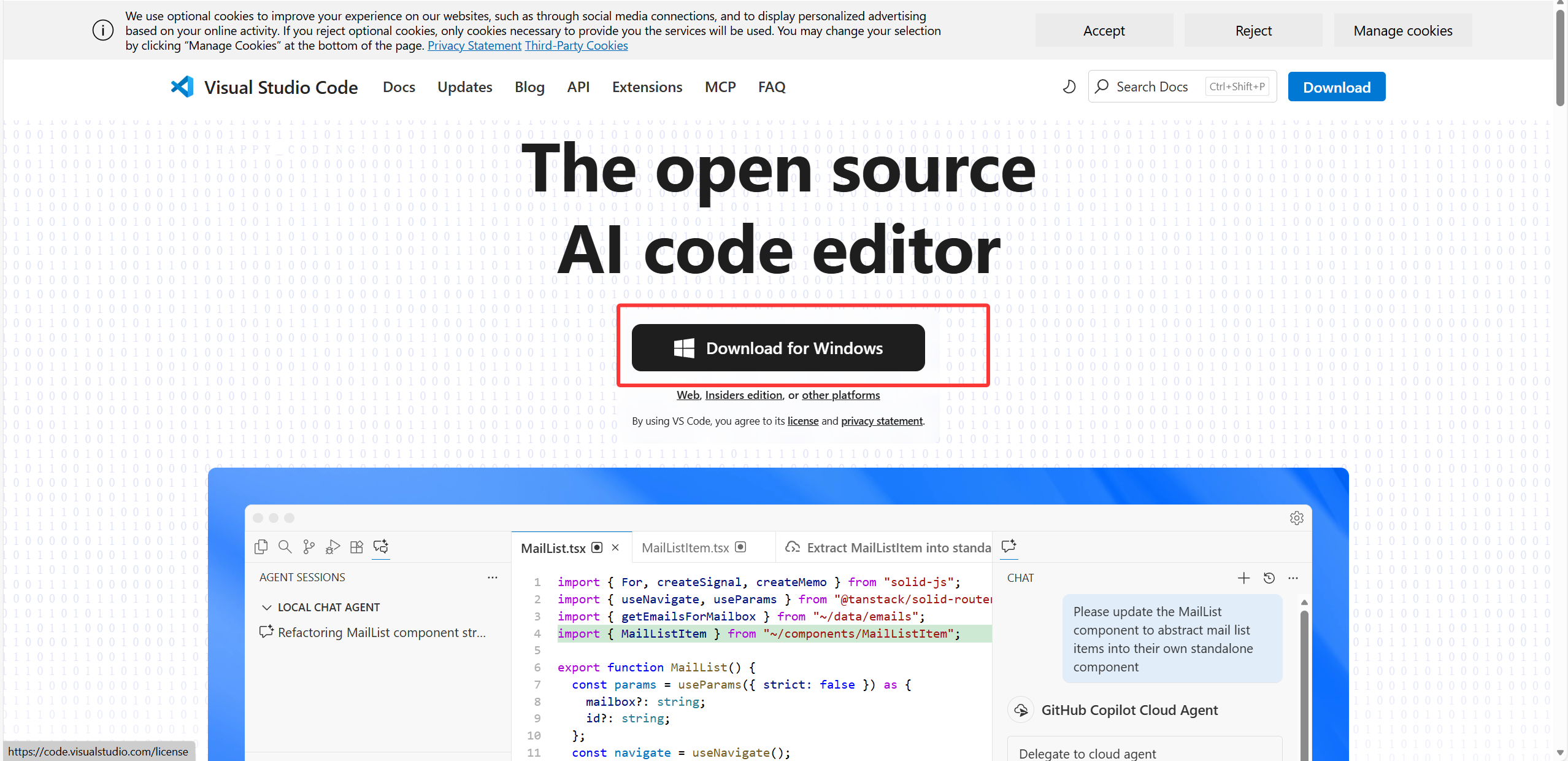 step1:进入vscode官网,点击download for Windows下载vscode。