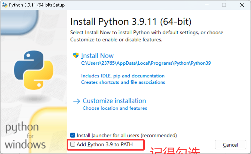 step1:安装图片的安装步骤进行安装,勾选完Add python 3.9 to PATH之后,点击install Now进行安装
