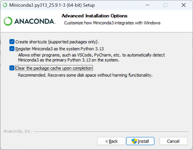 - 如果喜欢通过 PowerShell 来启动 Anaconda 环境,选择添加Anaconda Powershell;如果你更习惯使用 Windows 的命令提示符(CMD)可以选 Anaconda CMD