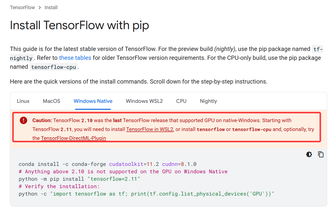 答:中文界面存在部分显示不全的问题,例如未像英文界面这样提示"TensorFlow版本超过2.10时将无法使用本地GPU训练"这一关键信息。导致新手安装完tensorflower后发现无法使用本地GPU训练自己的模型