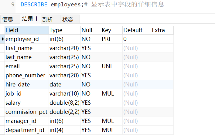 - 使用 DESCRIBE 或 DESC 命令,表示表的结构;