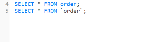 在第四行中,order 的颜色明显和关键字一样,会出现错误。