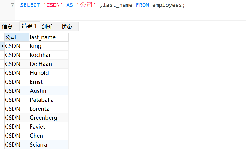 - SELECT 'CSDN' AS '公司' ,last_name FROM employees;