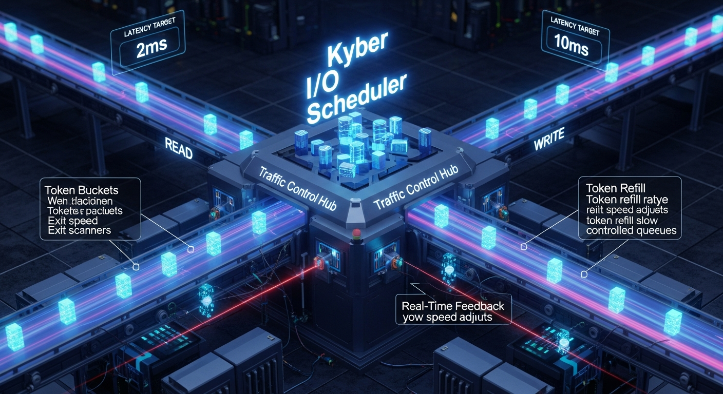 Kyber的核心是一个基于**反馈循环(Feedback Loop)的令牌桶(Token Bucket)**算法,它通过控制I/O请求的派发速率来主动管理设备队列深度,从而将延迟维持在目标水平。