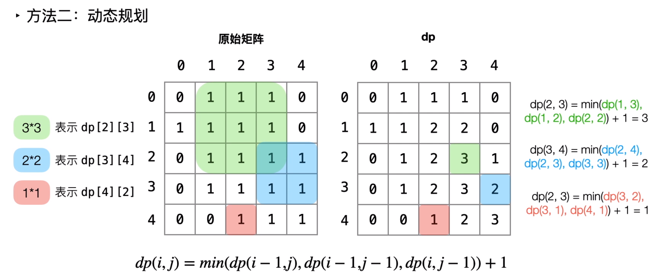 (i,j)为1,dp(i,j)为min(dp(i-1,j-1),dp(i-1,j),dp(i,j-1) )+1