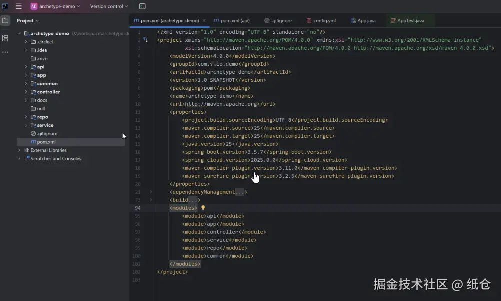 .idea、.claude 这种目录不想在生成项目的时候也生成,直接删掉样板代码中的目录,或者是修改 archetype-metadata.xml