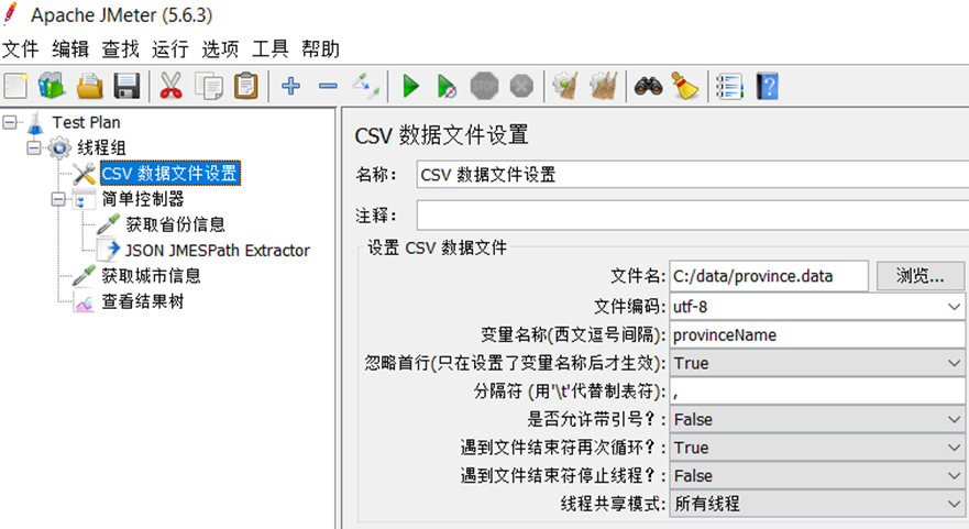 在理清了调用接口的先后顺序后,就可以先将所有的省份和直辖市数据作为一个参数化数据,因为在中国所有的省份和直辖市的名称是已知的,在Jmeter中,通常建议使用配置元件下的CSV 数据文件设置来进行参数化设置,如下图所示,在文件名设置中选择省份和直辖市对应的参数化数据文件的绝对路径,并且设置文件编码为utf-8,即表示通过utf-8的编码格式来读取参数化数据,避免出现乱码的情况,因为省份和直辖市名称都是中文形式的数据,如果编码格式选择不合适的话,可能会出现读取名称出现乱码的情况,在实际性能测试中,出现乱码时,通常都建议去排查下数据文件的编码格式和在Jmeter中设置的编码格式是否一致,如果不一致的话,通常就会产生乱码。在设置完文件编码后,在变量名称中设置provinceName来作为变量来存储读取到的省份或者直辖市名称。