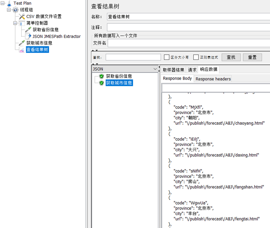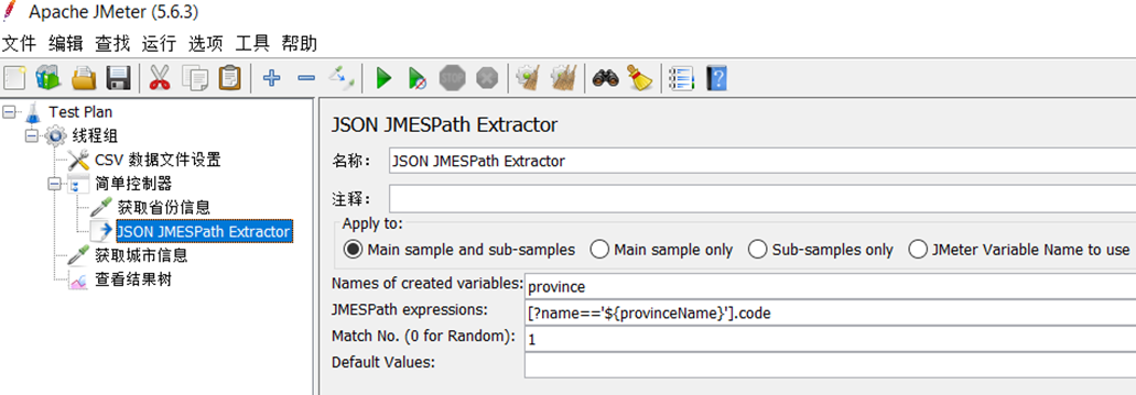 对应的代码赋值给province这个变量来存储以供下一个取样器调用接口获取该代码下对应的所有城市信息数据,设置JMESPath提取的表达式为[?name=='${provinceName}'].code,