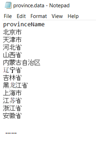 在参数化数据文件中,需要将所有的省份和直辖市的名称写入,如下图所示。