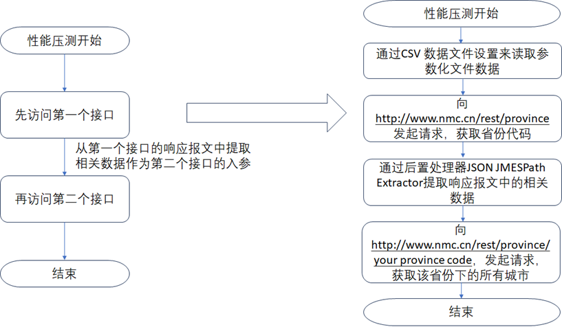 在性能测试中,除了会对单个接口请求进行性能压测外,也经常会遇到一些比较复杂的场景,比如需要同时对两个不同的接口请求进行性能压测,并且前一个接口请求返回的结果需要作为后一个接口请求的入参,如下图所示就是一个实际的示例演示,这个示例是以调用http://www.nmc.cn/rest/province/ 接口获取中国每一个省份或者直辖市下有哪些具体的城市信息来作为例子进行演示的。