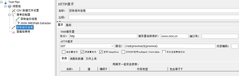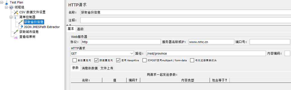 在通过JSON JMESPath Extractor获取到省份或者直辖市对应的代码后,就可以添加第二个取样器来发起请求调用http://www.nmc.cn/rest/province接口来获取省份或者直辖市下的所有城市信息数据了,如下图所示,从图中可以看到此时在接口URL中传入了${province}这个变量,这个变量代表的就是某个省份或者直辖市对应的代码。