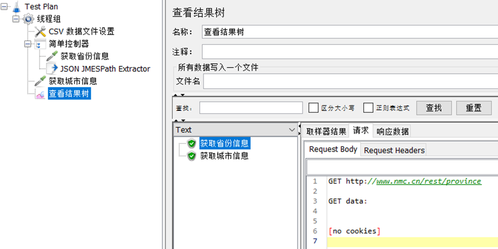 在完成上述的Jmeter元件添加以及配置后,建议再添加查看结果树元件以方便通过查看结果树来查看每个取样器的运行的结果,如下图所示,而且从图中可以看到当运行整个Jmeter测试计划后,在查看结果树中可以看到第一个取样器已经正常发出了调用http://www.nmc.cn/rest/province接口的请求。