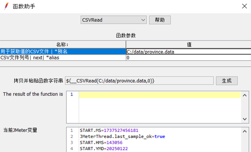 在这个示例中,省份或者直辖市名称的参数化数据是通过Jmeter配置元件下的CSV数据文件设置来实现的,除了通过这种方式可以实现外,还可以通过Jmeter函数助手中的CSVRead 函数来实现,如下图所示。
