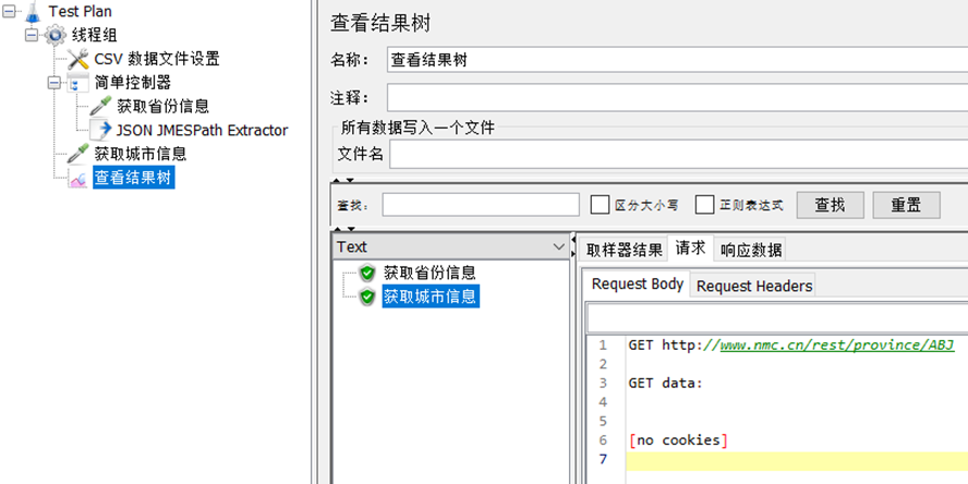 从查看结果树中看到,第二个取样器也正常发出了调用接口的请求,请求的URL地址为http://www.nmc.cn/rest/province/ABJ,如下图所示,可以看到在URL地址中,已经添加上了对应的省份或者直辖市的代码,由于在参数化数据中,第一个设置的参数化数据为北京市,并且从第一个取样器返回的响应数据可以知道,北京市的代码为ABJ,所以此时首次运行时,第二个取样器请求的URL地址应该为http://www.nmc.cn/rest/province/ABJ,查看结果树中显示的实际结果和预期结果是完全匹配的,这说明性能测试脚本的运行符合预期。如下图所示,通过查看获取城市信息这个取样器的响应数据,可以