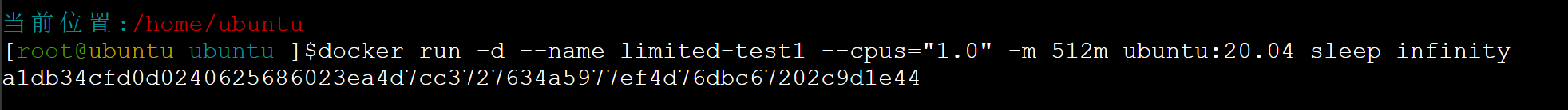 docker run -d --name limited-test --cpus="1.0" -m 512m ubuntu:20.04 sleep infinity