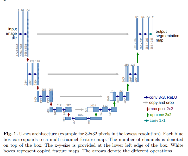 后面就是需要逐步进行上采样,每次上采样后,左边对应的特征层,会crop出来,然后和当前的特征进行通道上的扩充