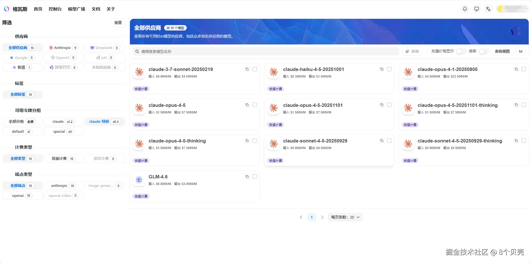 这是我最初被吸引的原因。这个平台聚合了 7大主流厂商 的 53个模型 ,堪称"全家桶"级别的覆盖。 **** 从图中可以看到,从OpenAI的 GPT-4o-image、GPT-5系列,到Anthropic的全系Claude模型(包括带 thinking的思考版),再到Google的 Gemini 3.0、Gemini 2.5 Pro,以及智谱AI、DeepSeek等,应有尽有。这意味着你几乎不需要再为某个特定模型去单独注册账号。