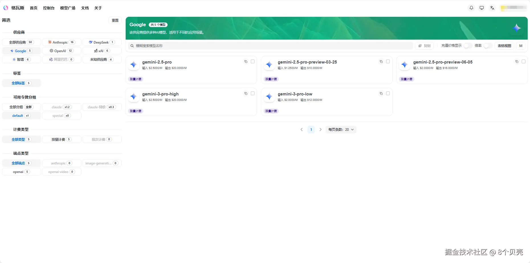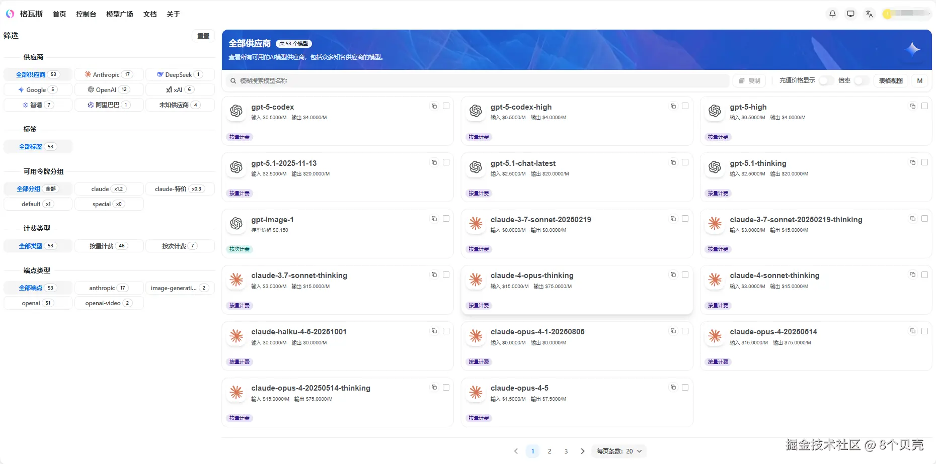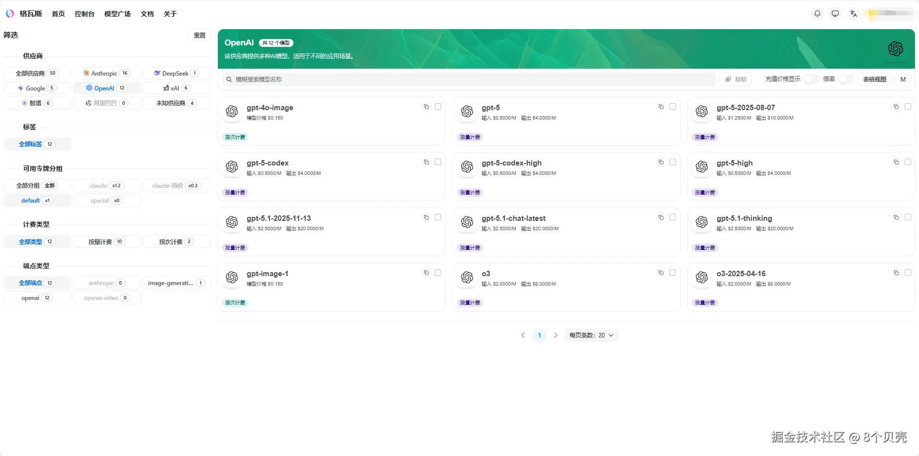 ** (图片说明:OpenAI供应商的模型列表,不仅包含GPT-5.1,还有GPT-5-Codex等专用模型,满足编程等专业需求。) 界面左侧提供了强大的筛选功能,可以按供应商、标签、计费类型等快速定位模型。每个模型卡片的输入/输出价格、计费方式都标注得非常清楚,消费完全透明。