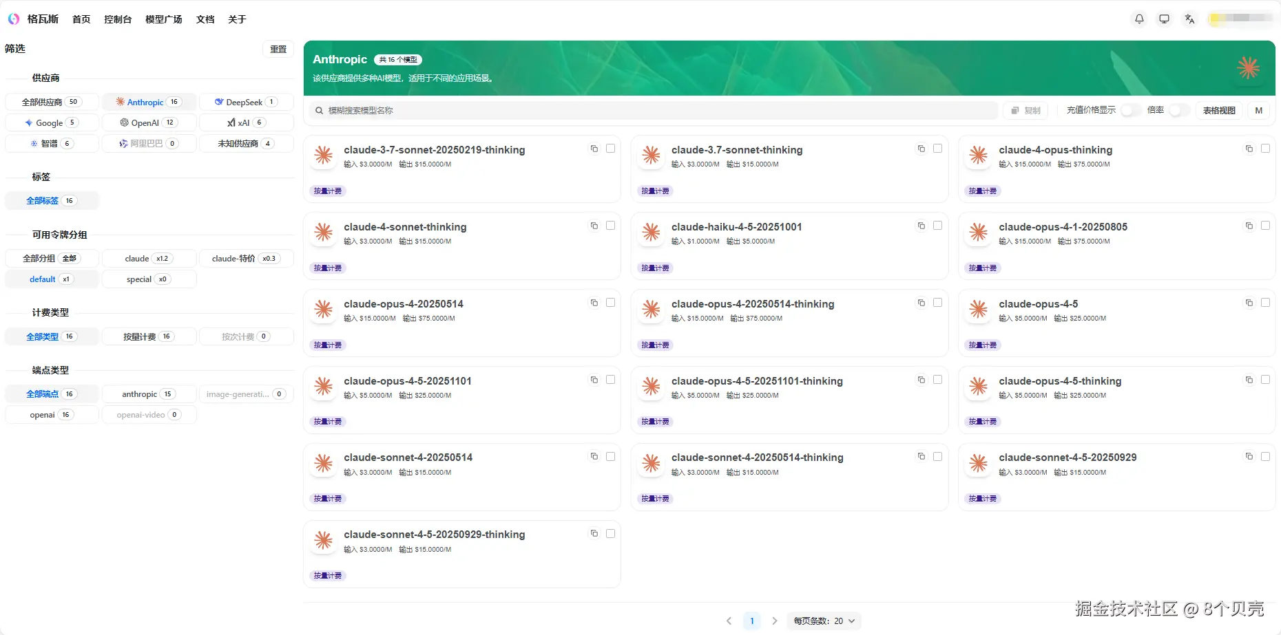 (图片说明:筛选Anthropic供应商后,清晰列出所有15个Claude模型,包括最新的3.7和4.5系列,价格和计费方式一目了然。)