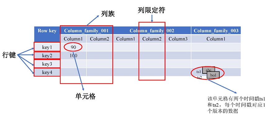 key1、key2...,列族是Column_family_001等。注意看右下角的单元格,它存储了ts1和ts2两个版本的数据,这就是HBase的多版本特性。*