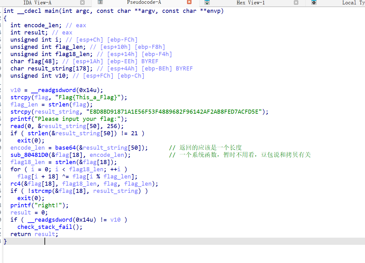 大概思路是找到&flag[18],根据代码,它先RC4,再异或Flag{xxxx}字符串,最终base解密即可!